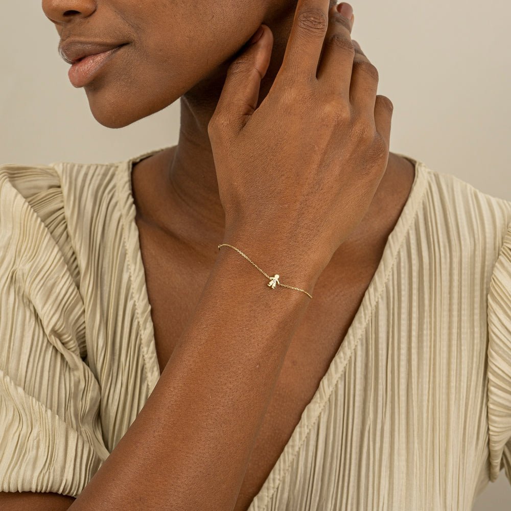 At the heart of this bracelet lies a playful silhouette of a baby boy, expertly crafted from 14k solid gold. With its adorable design and intricate detailing, it’s a whimsical symbol of innocence and joy, reminiscent of the laughter and love that surrounds a newborn.