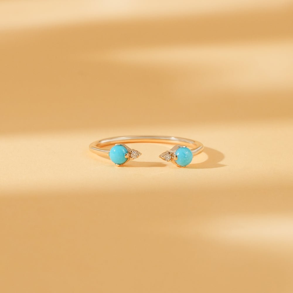 With a total turquoise carat weight of 0.26 ctw and diamond weight of 0.06 ctw, this ring is ideal for stacking or wearing solo as a statement of minimalist elegance. The open setting provides a contemporary twist while allowing light to accentuate each stone’s brilliance. Whether you’re marking a milestone or simply treating yourself, this ring delivers a fresh, elegant aesthetic that never fades with time.