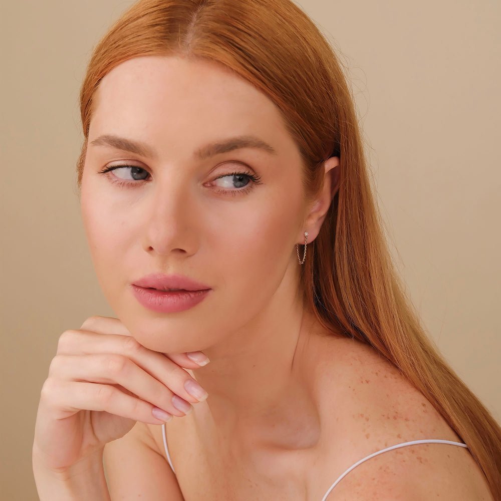 What sets these earrings apart is the addition of a dainty curb chain, adding a touch of modernity and intrigue to the design. Crafted in solid gold, the chains gracefully dangle from the diamond studs, creating a captivating visual effect that catches the eye.