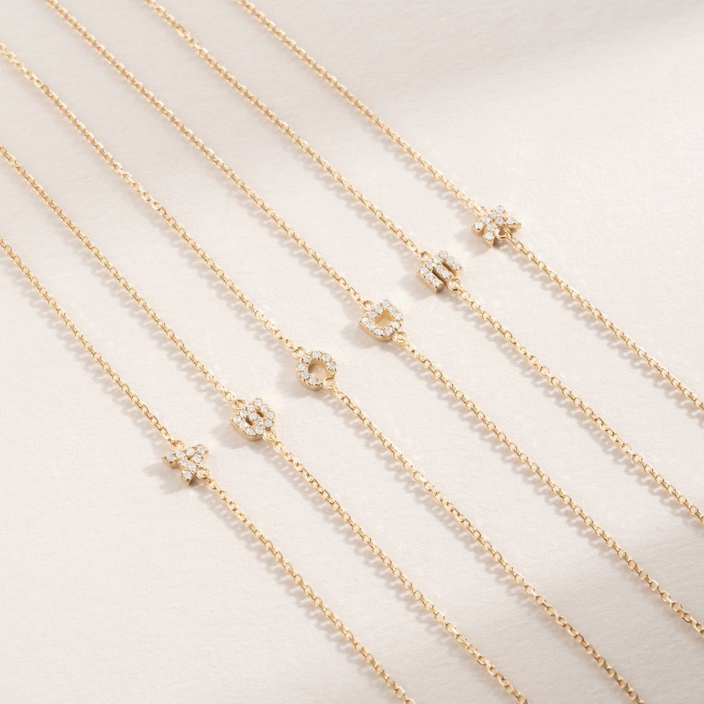 Make a statement with our Diamond Initial Bracelet, featuring your chosen letter crafted in sparkling diamonds on a solid gold chain.