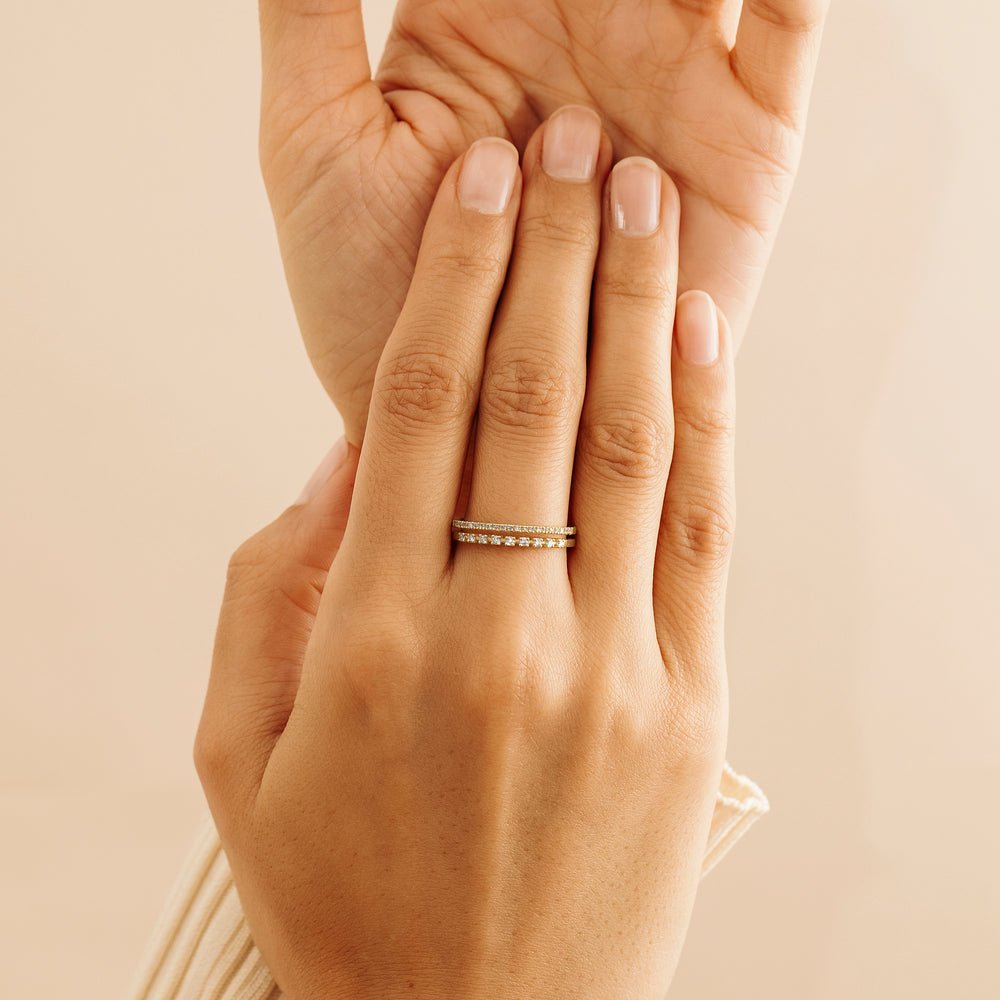Celebrate elegance and modern design with the 14K Solid Gold Natural Double Diamond Band from The Karat Store. This beautifully crafted ring features two delicate bands, each measuring 1.3 mm, joined together to create a stunning 3 mm wide band that exudes sophistication and charm. Crafted from premium 14K solid gold, available in White, Rose, and Yellow Gold, this ring is the perfect blend of style and craftsmanship.