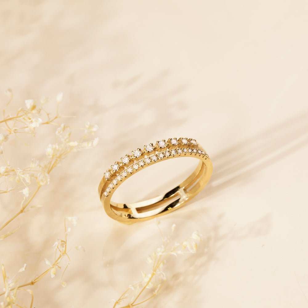14K Gold Double Diamond Band with 0.20 ct GH/VS-SI natural diamonds. Dual 1.3 mm bands, 3 mm total width. GIA & BIS certified.