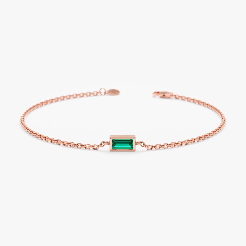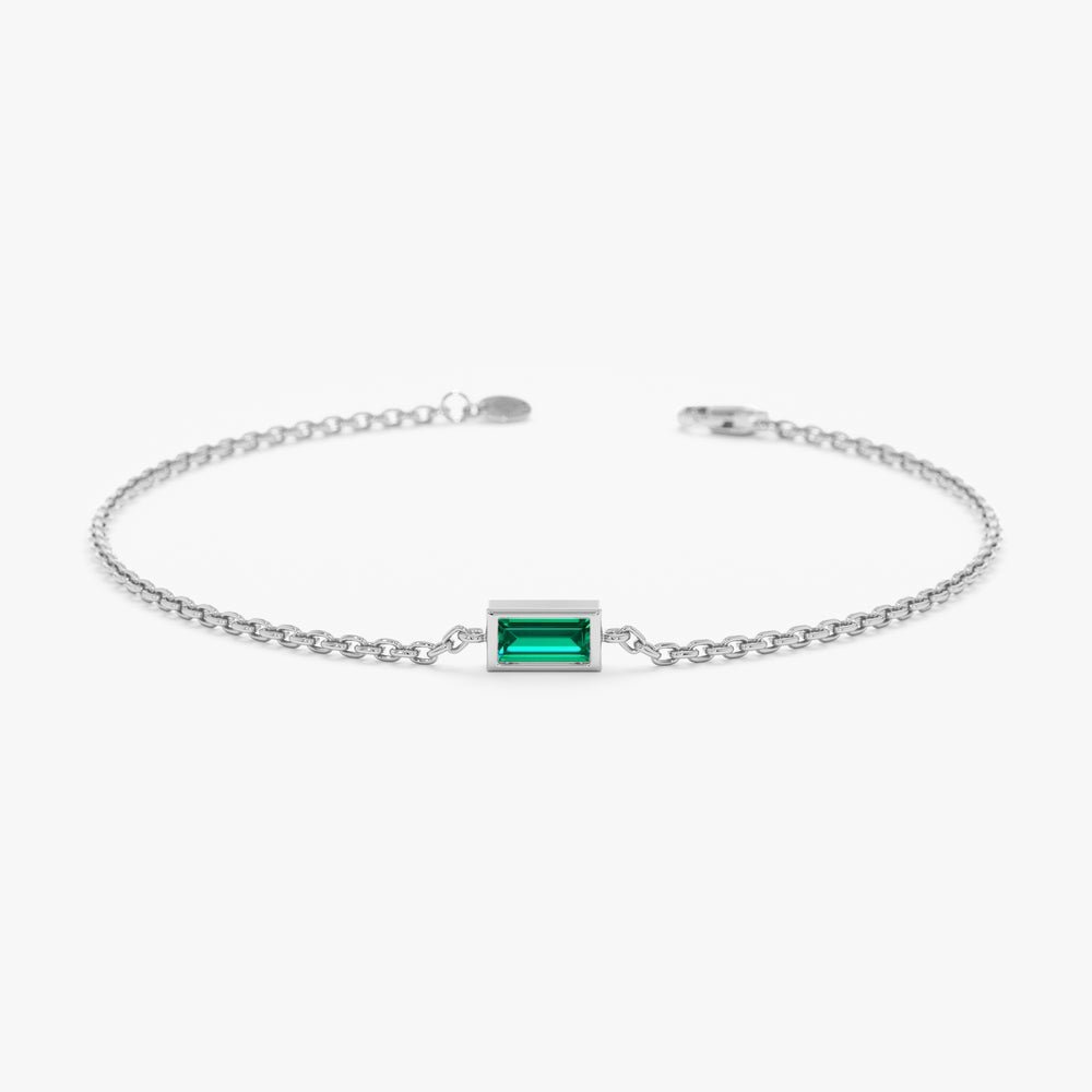At the heart of the bracelet lies a single, radiant emerald gemstone, expertly cut into a sleek baguette shape to enhance its natural beauty and brilliance. The rich green hue of the emerald symbolizes vitality, growth, and renewal, making it a meaningful and cherished gemstone.