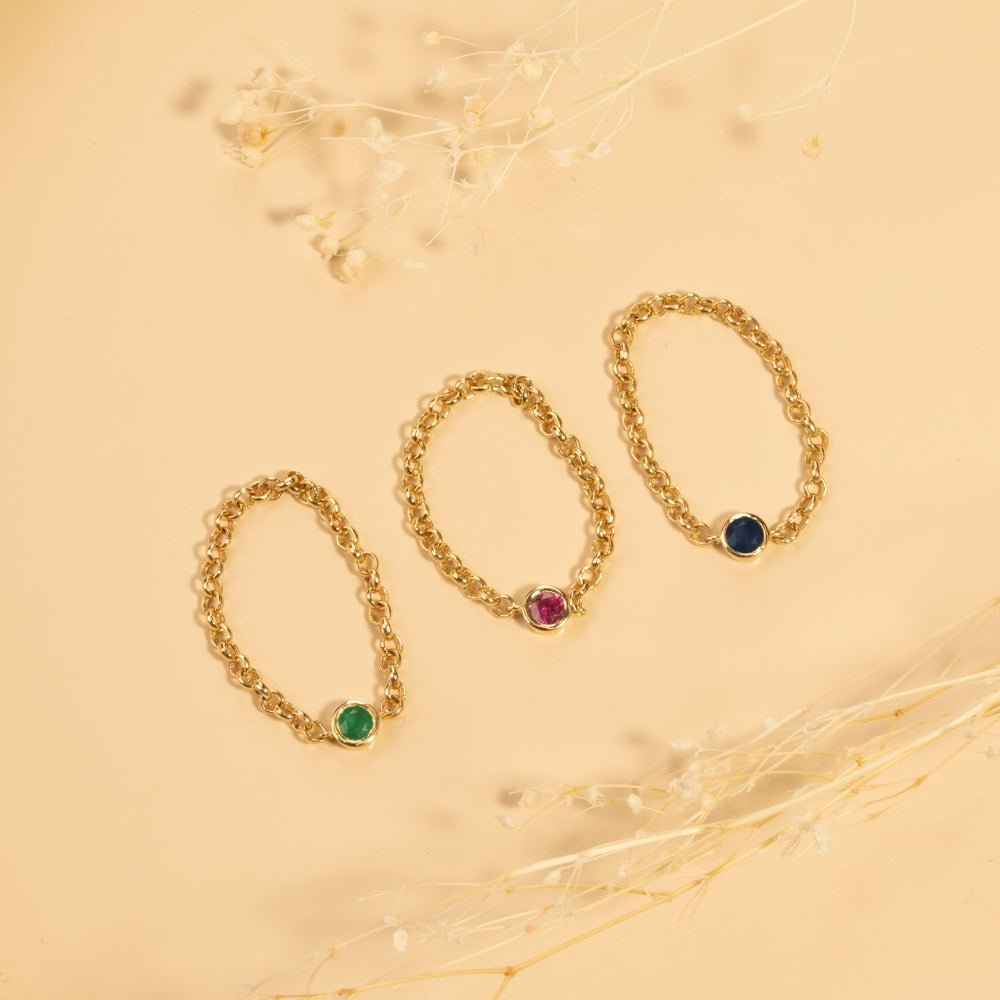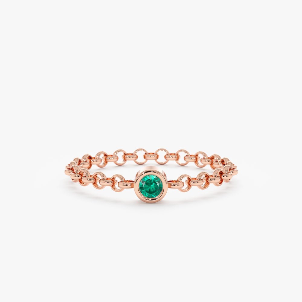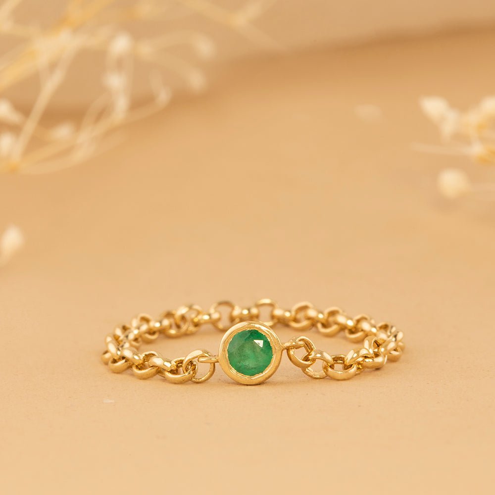 A delicate 14K solid gold chain ring featuring a vibrant emerald, offering a minimalist and elegant design perfect for everyday wear or stacking.