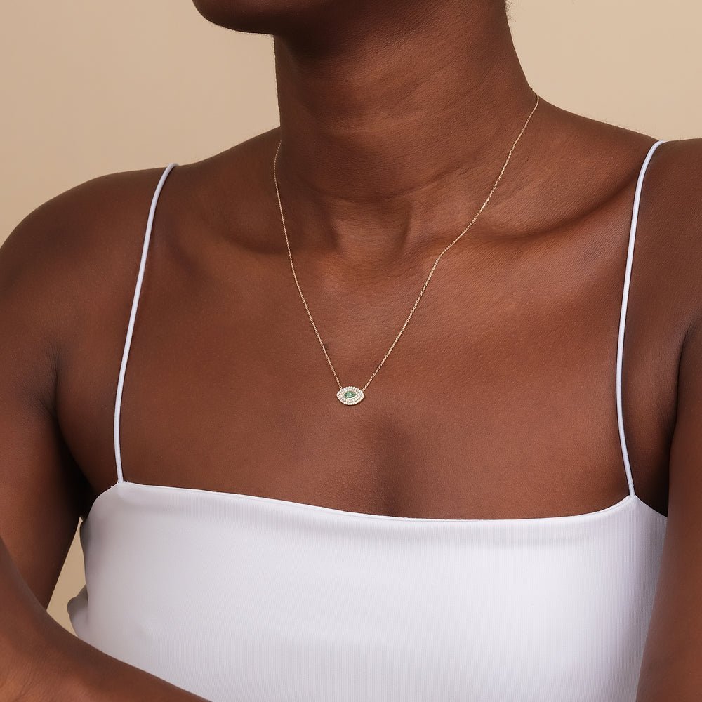 Embrace elegance and protection with our Emerald Diamond Evil Eye Necklace. Handmade from solid gold, featuring a captivating marquise-cut emerald framed by sparkling pave diamonds.
