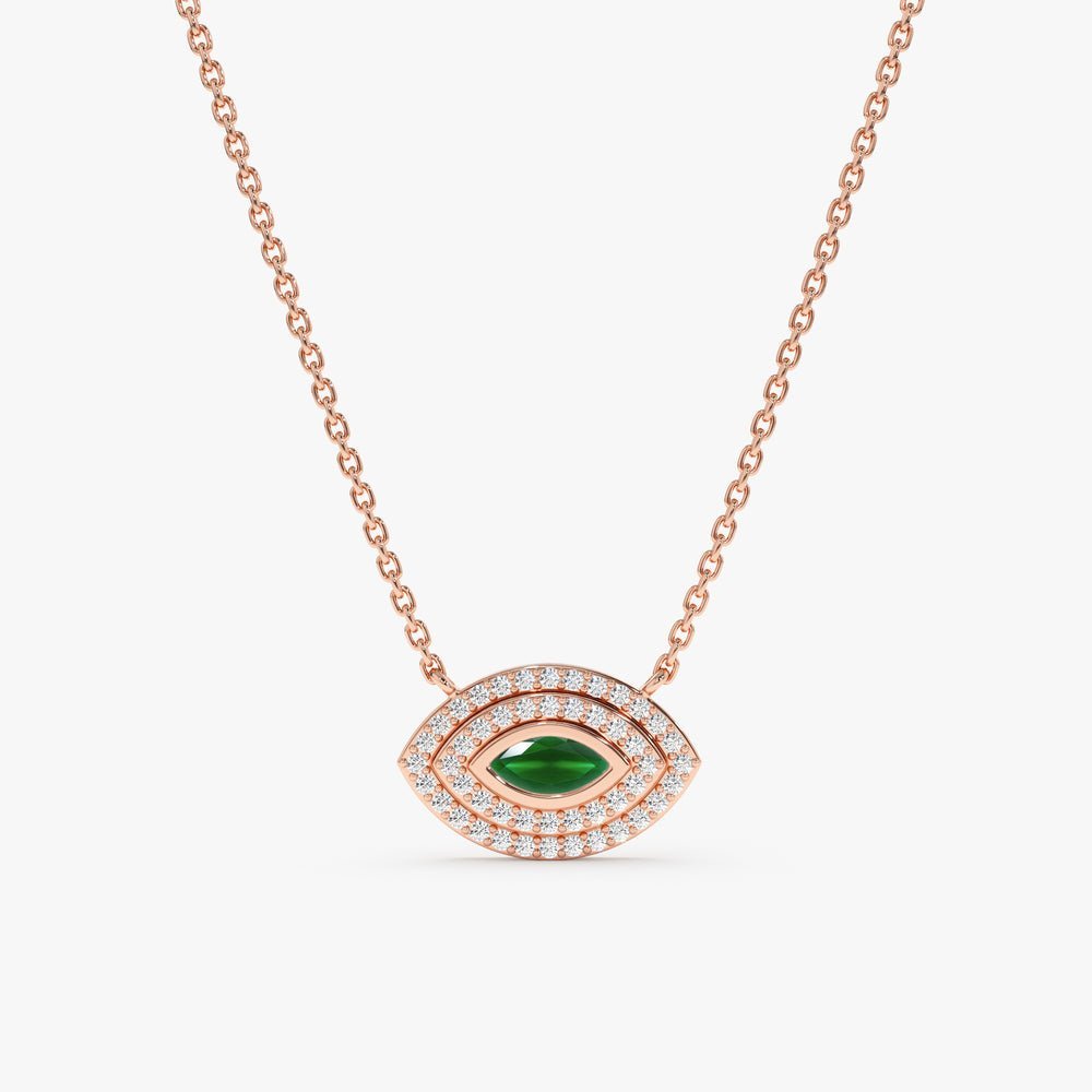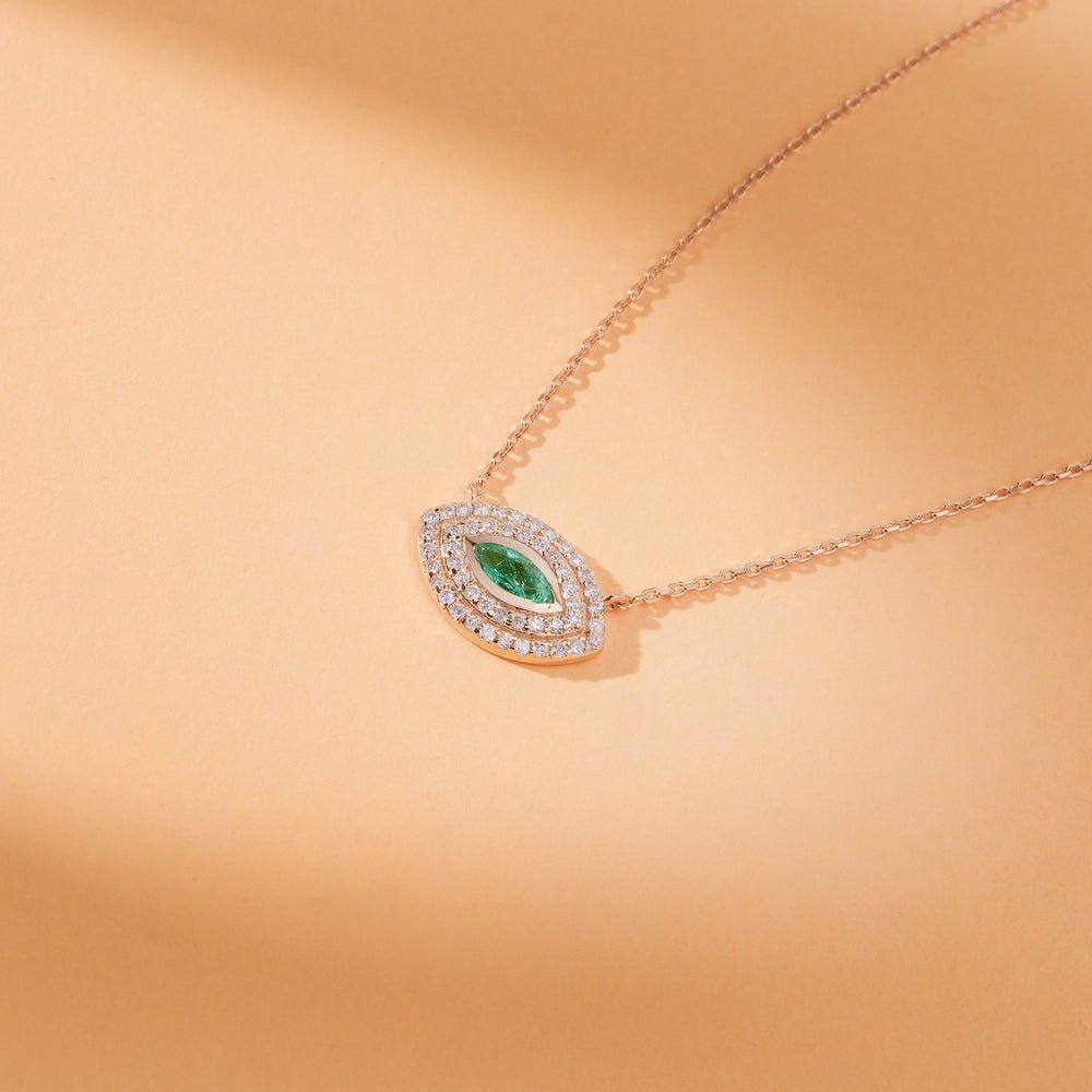Elevate your style with our Emerald Diamond Evil Eye Necklace, a timeless symbol of elegance and protection. This exquisite piece is meticulously handcrafted by our skilled goldsmiths, showcasing a captivating marquise-cut emerald as its centerpiece. Symbolizing growth, prosperity, and hope with its vibrant green hue, the emerald exudes a sense of timeless elegance and symbolism.