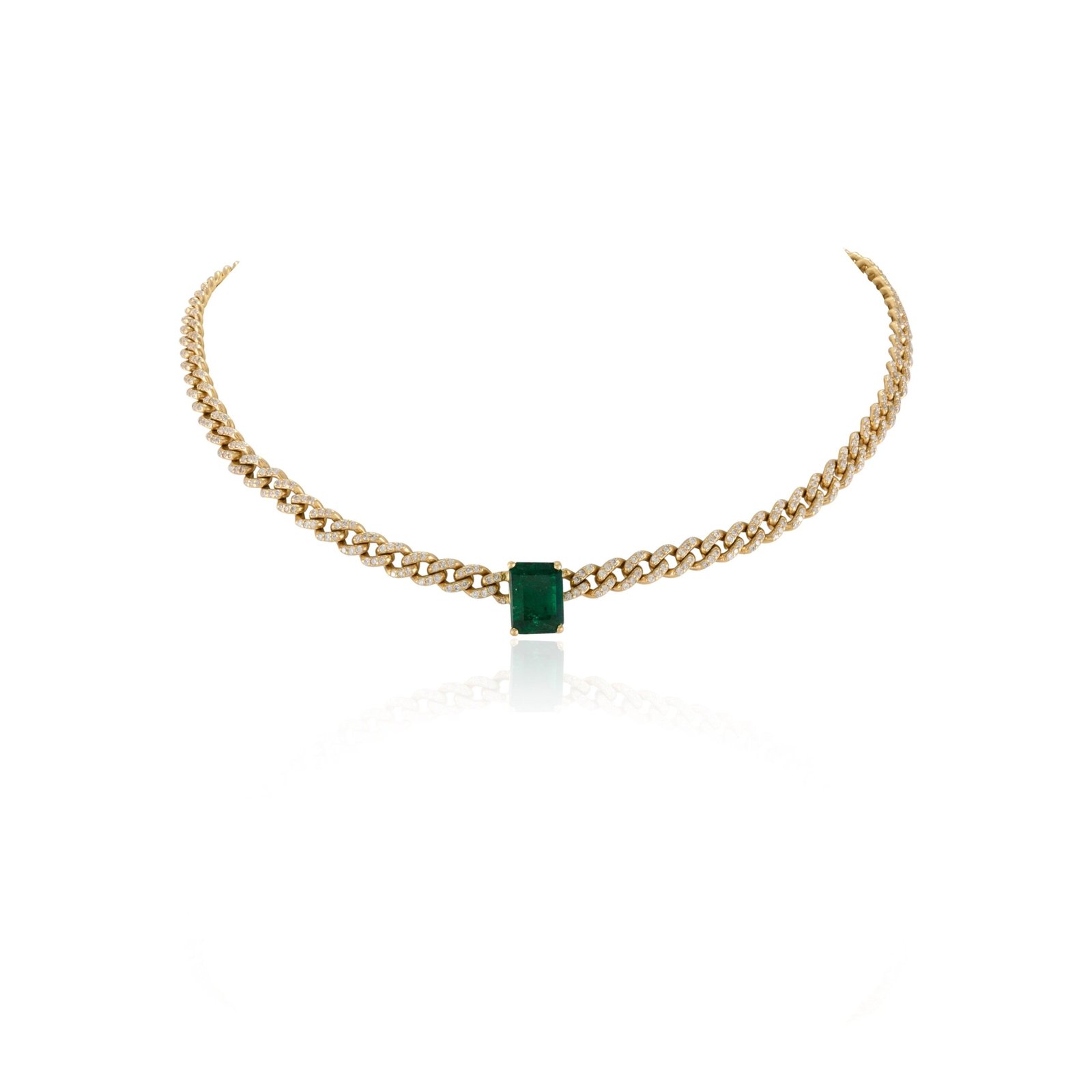 Surrounding the emerald are two rows of sparkling pave diamonds, meticulously set to enhance the necklace’s luxurious appeal and add brilliance to the design. Crafted from solid gold, this necklace radiates sophistication and craftsmanship, making it a cherished addition to any jewelry collection.