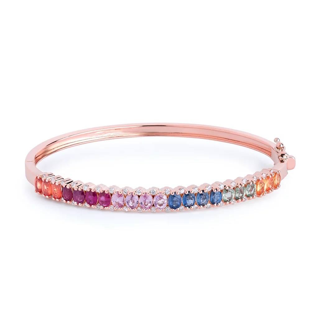 Celebrate elegance and vibrancy with the 14K Solid Gold Festival Soul Bangle, a true statement piece for any jewelry lover. This exquisite bangle is crafted from premium 14K gold and boasts stunning white diamonds totaling 0.57 carats and captivating multicolor sapphires weighing 4.12 carats.