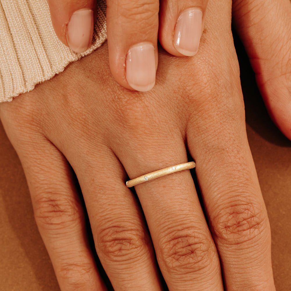A sleek 2mm brushed 14K gold band with flush-set natural diamonds, combining minimalist style with subtle sparkle.