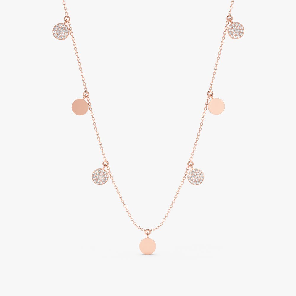 Mixed Coin Drop Necklace: An eye-catching piece, handmade from solid gold, featuring alternating gold disks and diamond pave disks along a delicate chain.