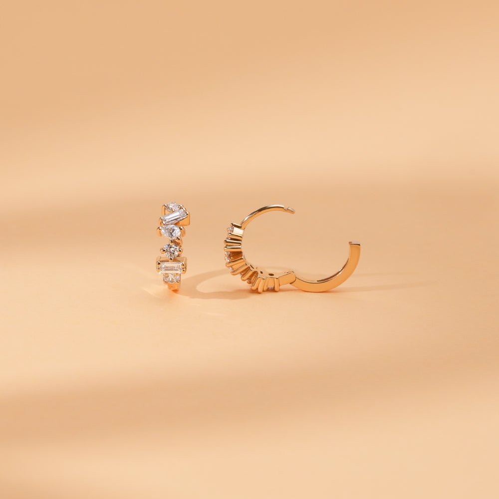 Our Mixed Natural Diamond Cluster Huggies combine modern flair with timeless elegance. Handcrafted from solid gold, each earring features a captivating cluster of sparkling natural diamonds in a mesmerizing mix of cuts.