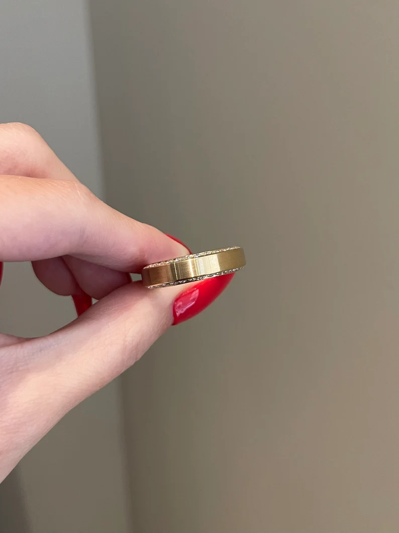 The matte finish provides a contemporary twist, ensuring this wedding band stands out while maintaining a classic appeal. Whether you’re saying “I do” or reaffirming your commitment, the Moissanite Men’s Wedding Band is a timeless choice that reflects your unique style.