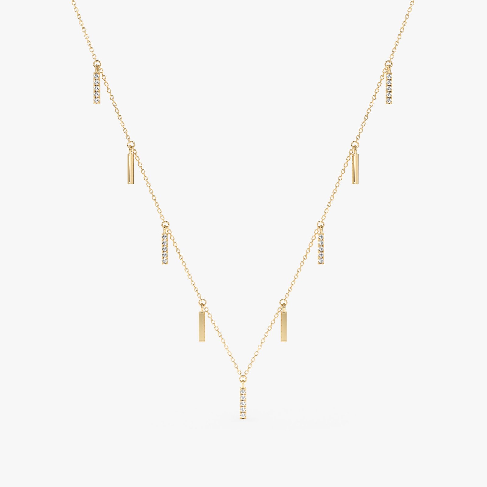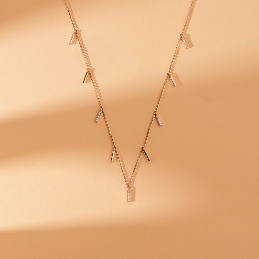 Diamond Bar Charm Necklace: Elevate your look with this handmade necklace featuring a delicate chain adorned with nine diamond-paved bars, creating a cascade of sparkling brilliance with every move.