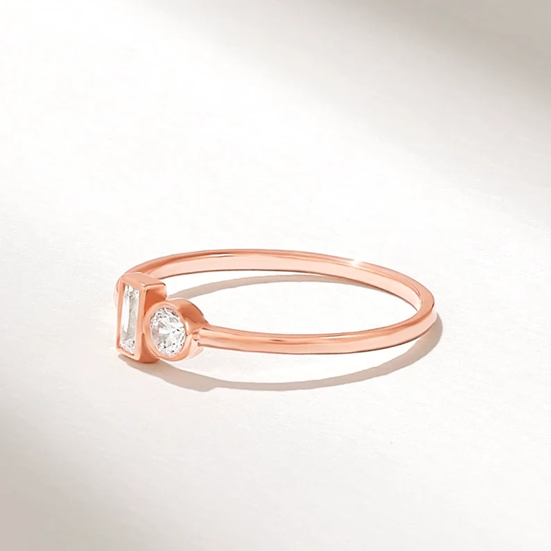 Celebrate love with the Natural Diamond Baguette Round Ring, a stunning 14kt mixed cut engagement ring designed to symbolize the perfect union of two souls. This elegant “You and Me” ring features a captivating combination of a baguette-cut and a round-cut natural diamond, each carefully selected for its brilliance and clarity. Crafted in 14K solid gold, available in white, rose, or yellow gold, this ring exudes sophistication and modern charm.