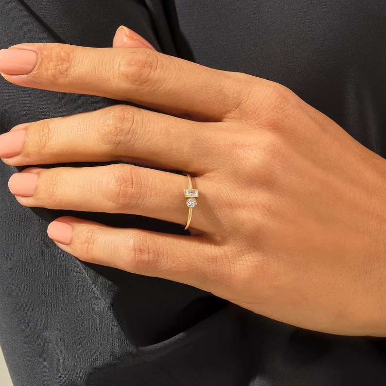 Natural Diamond Baguette Round Ring | 14kt Mixed Cut Engagement Ring | You and Me Ring