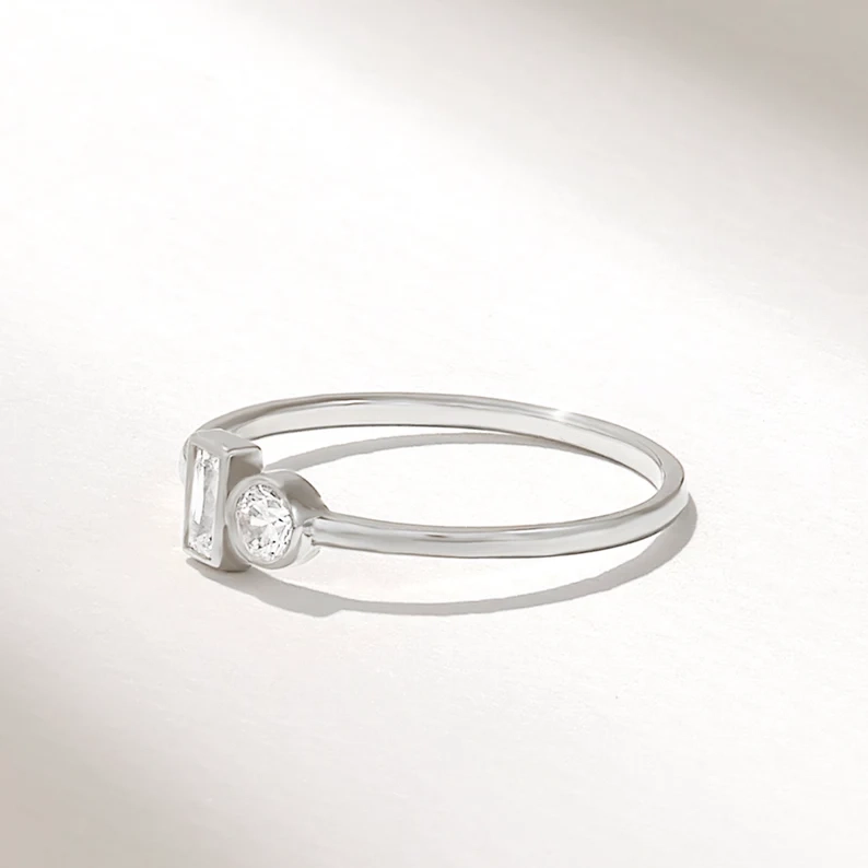 A dazzling 14kt mixed cut engagement ring featuring a baguette and round natural diamond, set in solid gold (white, rose, or yellow). With D-E-F color, VVS clarity natural diamonds (0.19 ctw), this “You and Me” ring is a timeless symbol of love and elegance.