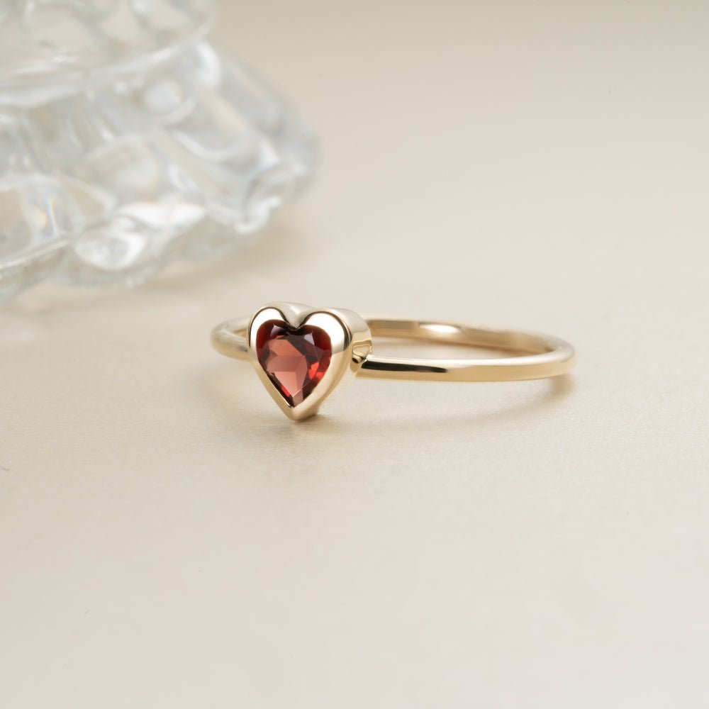 A romantic 14K solid gold ring featuring a heart-shaped natural garnet, offering a vibrant and elegant symbol of love and passion.