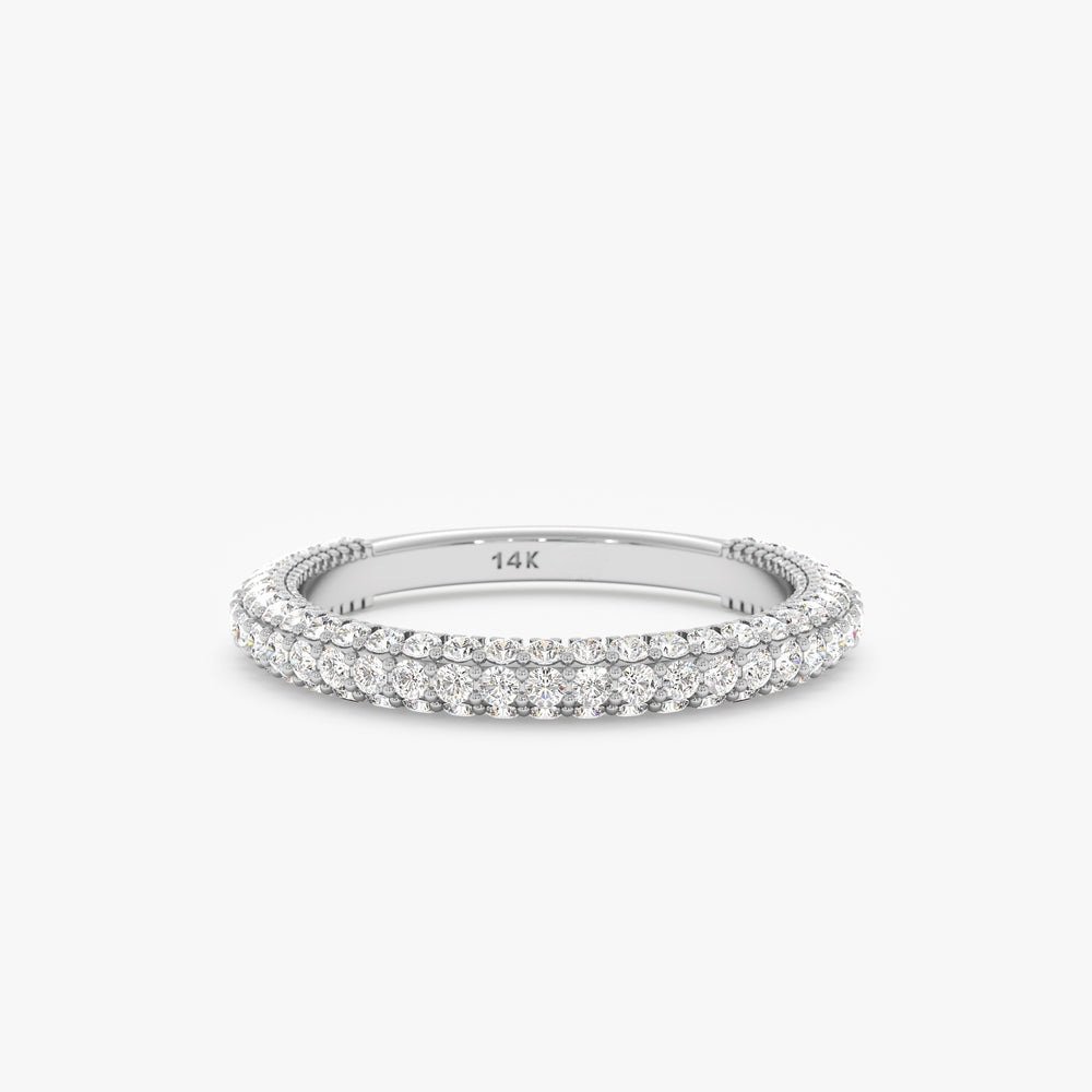 The slightly domed profile, with a band width of 2.5 mm and height of 2.3 mm, ensures a substantial yet wearable design—perfect for making a statement alone or enhancing a stack. Whether worn as a wedding band, anniversary ring, or a show-stopping accessory for special occasions, this piece embodies timeless glamor and handcrafted artistry. Available in yellow, white, or rose gold, it is a celebration of enduring beauty and elegance for those who seek brilliance in every detail.