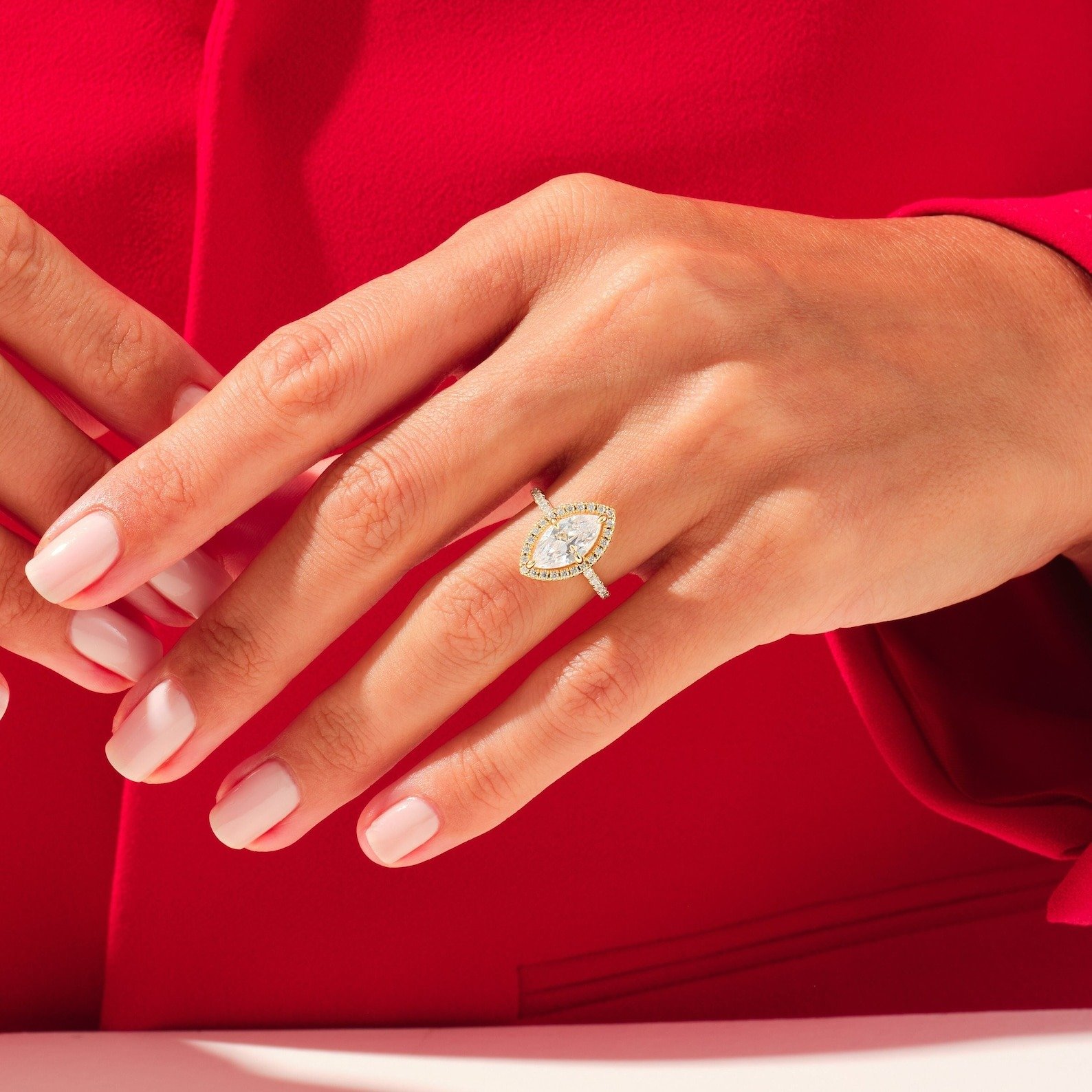 Bold 4ct marquise-cut moissanite halo engagement ring in 14K solid gold. D color, VVS1 clarity. GRA & BIS hallmarked for certified brilliance.