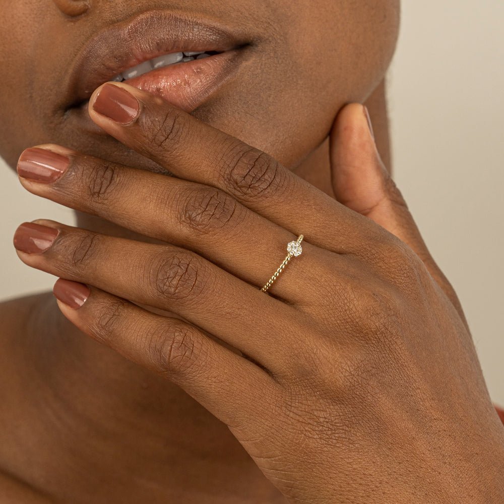 The petite diamond flower beaded band is delicate and feminine, perfect for stacking or wearing on its own.