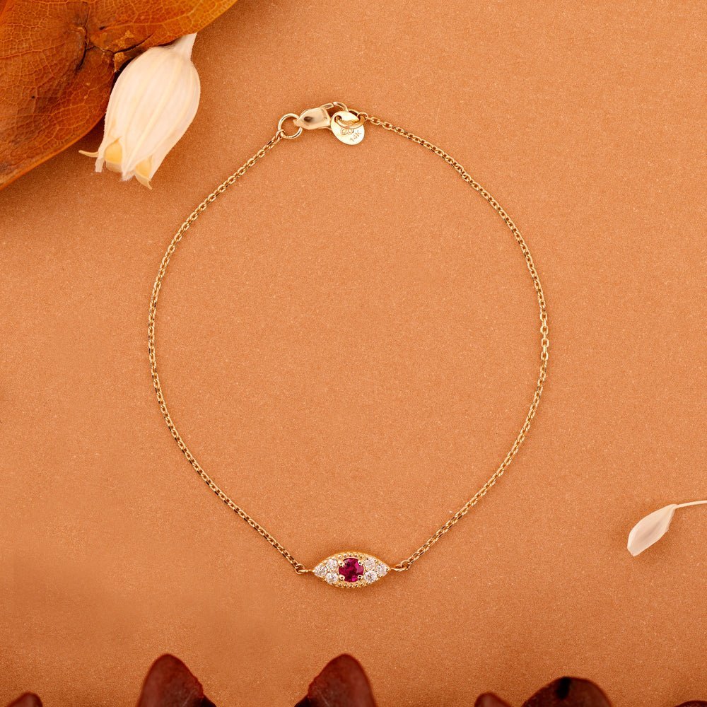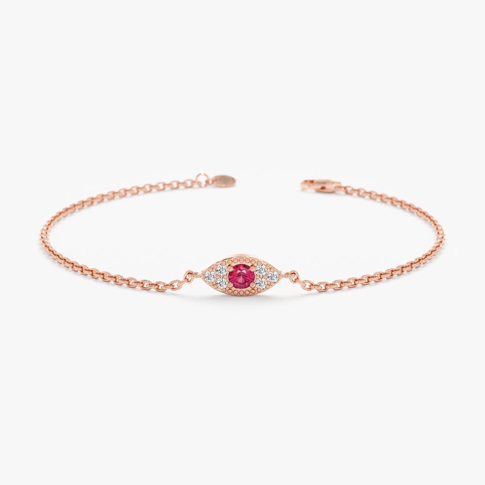 A stunning 14K solid gold bracelet featuring a ruby eye design accented with diamonds, offering both protection and elegance in a sophisticated piece.