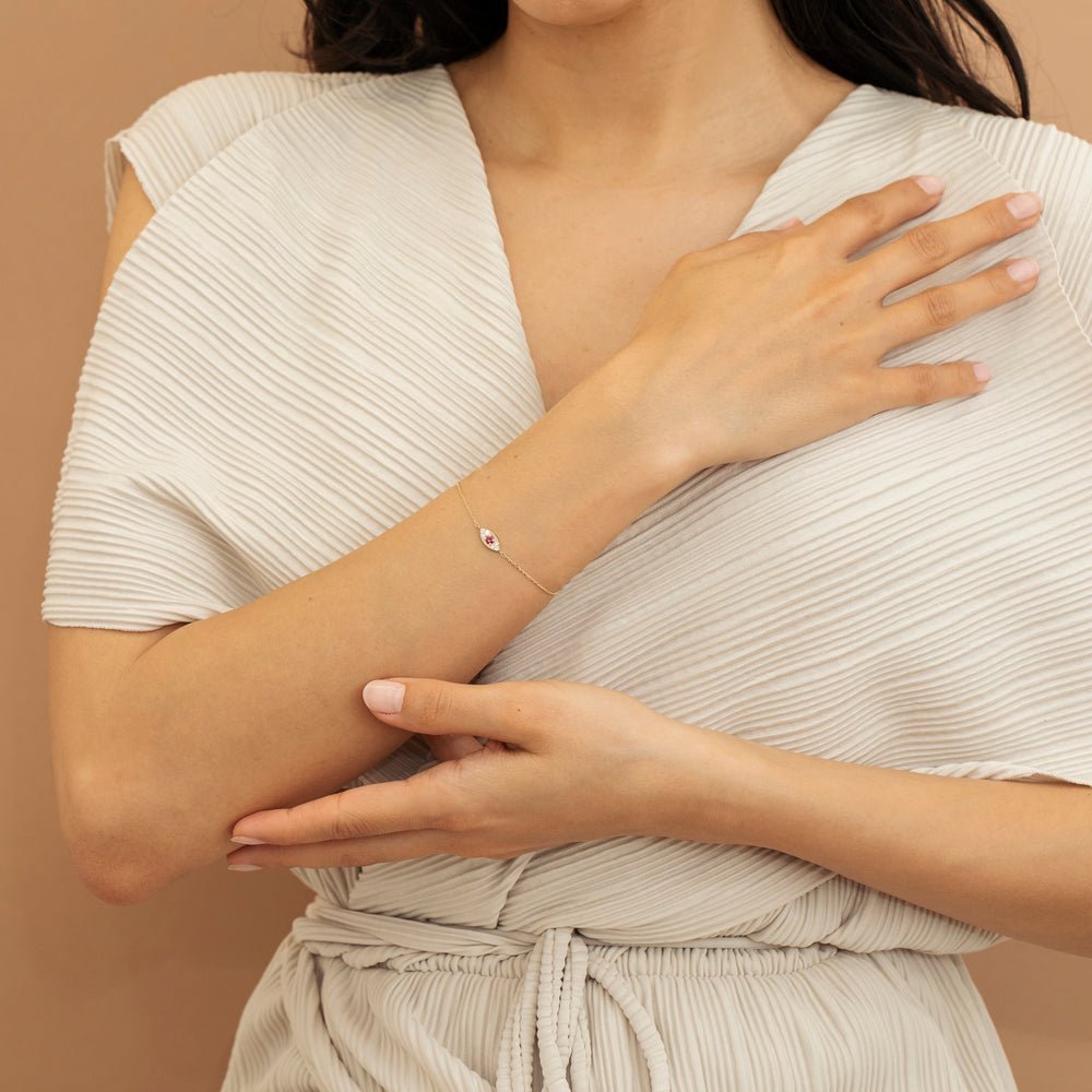Add a touch of elegance and protection to your ensemble with our Ruby Eye Diamond Bracelet, a stunning piece that combines timeless style with symbolic significance. Handcrafted with care and attention to detail, this bracelet features an eye-catching evil eye charm, crafted from lustrous 14K Solid Gold.
