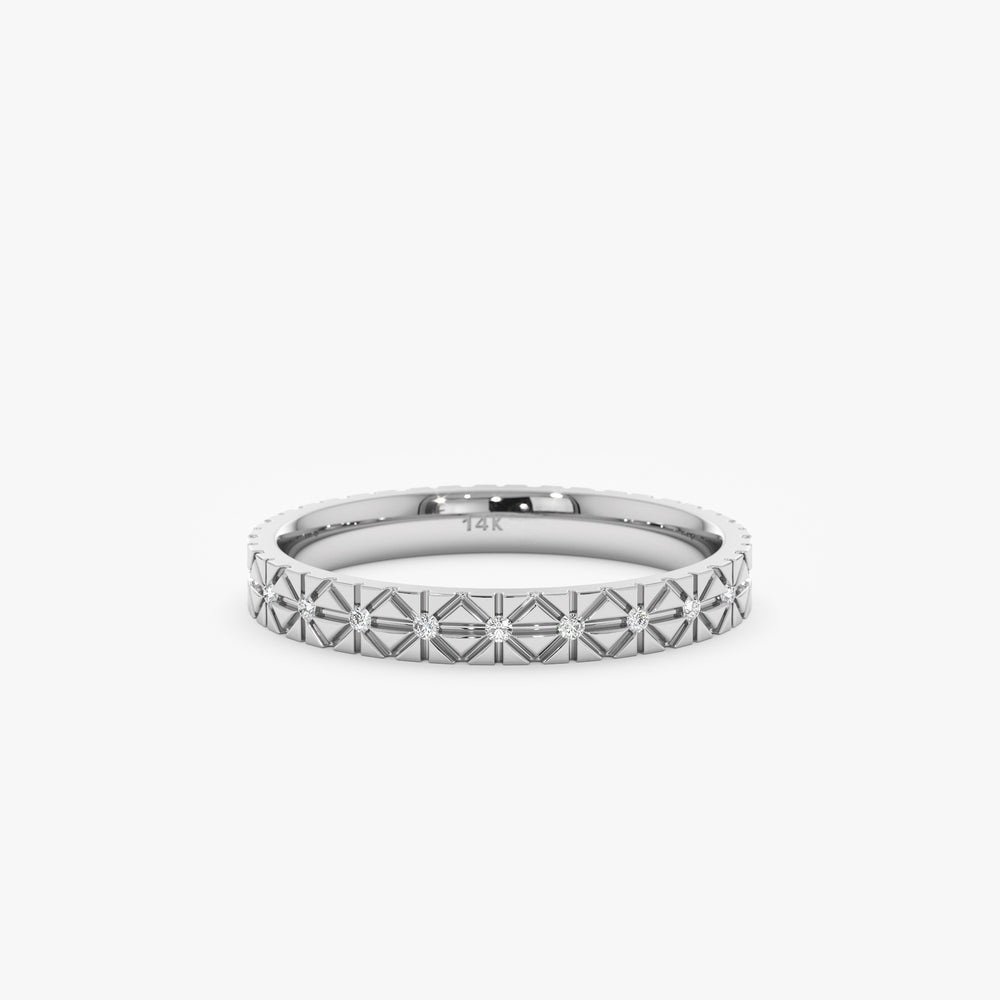14K solid gold eternity band with engraved starbursts and 0.10ct natural diamonds. A celestial stacking ring with timeless charm.