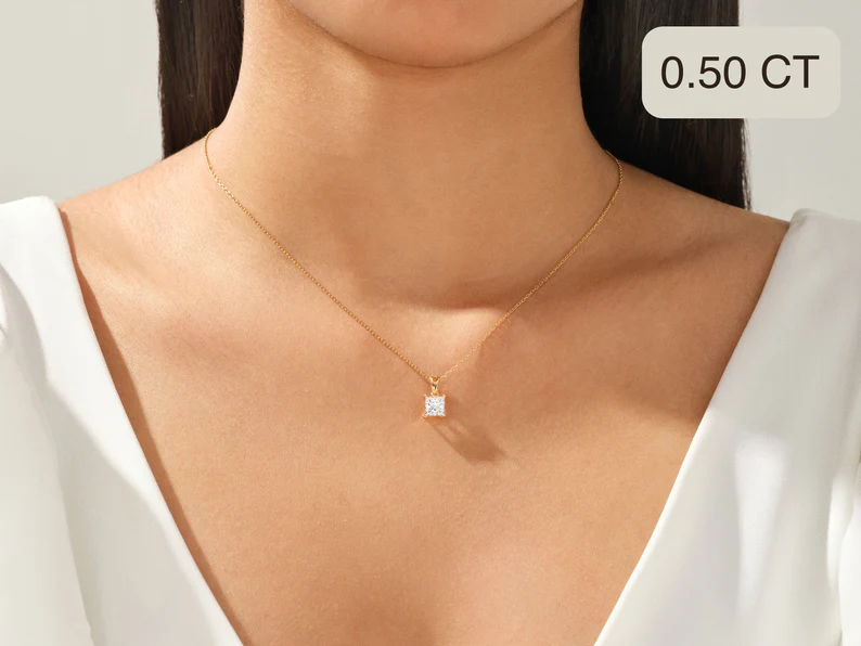 This 14K solid gold necklace features a 0.5 CT princess cut moissanite diamond solitaire—offering refined brilliance in a classic, elegant pendant design.