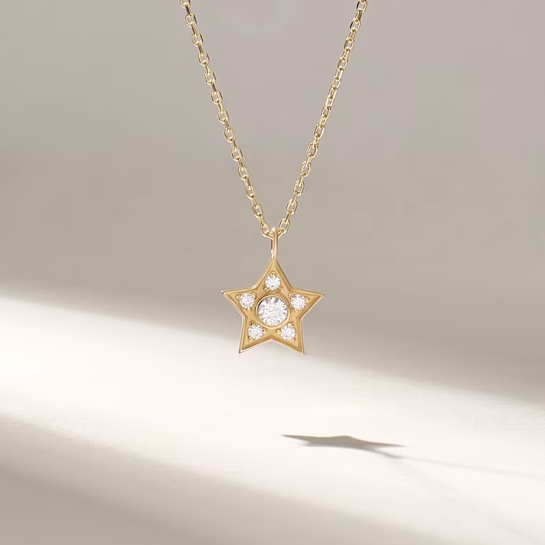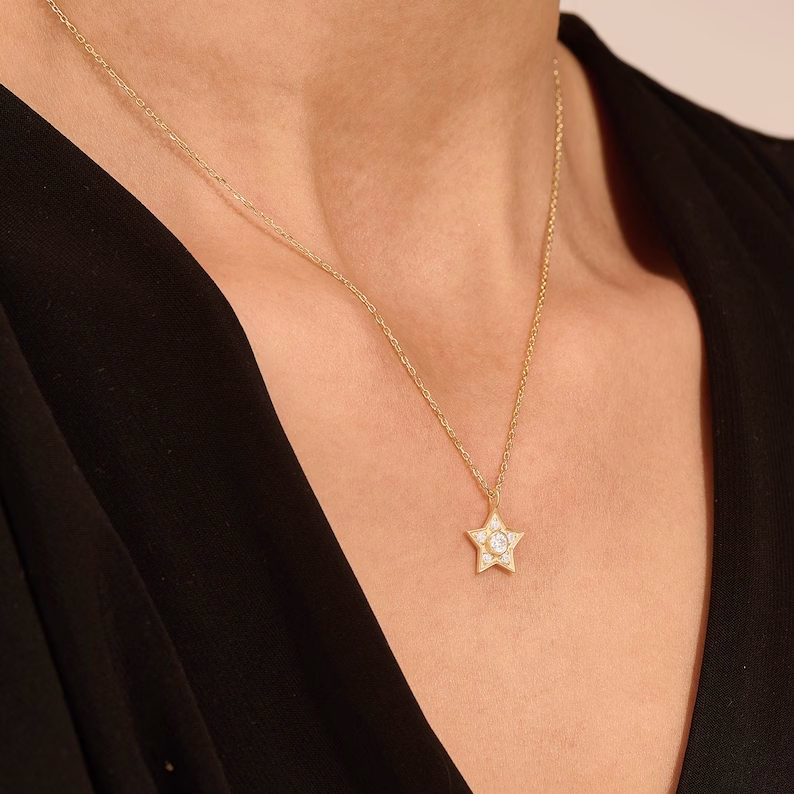 18k Solid GoldNatural Diamond Star Necklace: Tiny Solitaire Pendant for Stacking Choker
